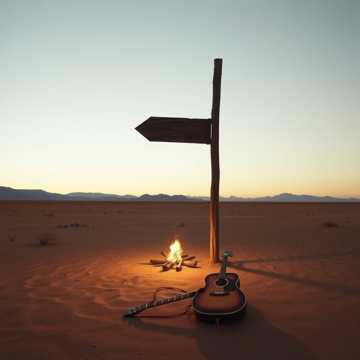 alien speak vocoder tons of reverb and vibrato robot sounding voice, Slow TV-western campfire ballad, ~70 BPM in 3/4. Opens with fire crackle and distant coyotes. A breathy harmonica plays a lonely minor pentatonic melody with wide bends. Fingerpicked acoustic guitar carries a boom-chick-chick waltz pulse, slightly detuned and woody. Deep, weathered baritone vocal sings a sparse storytelling melody about loss and long desert roads, with long pauses between lines.